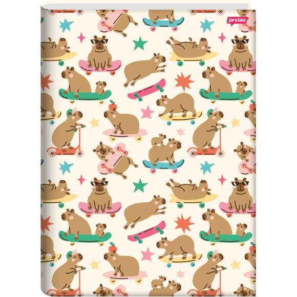 Inspirada na calmaria e fofura das capivaras, a linha Capy traz ilustrações delicadas, tons suaves e cenas cotidianas cheias de humor leve. Com quatro capas cheias de personalidade, traz as capivaras em cenas divertidas e expressivas — andando de skate, flutuando com balões, meditando ou fazendo caretas fofas. Os tons pastel e as ilustrações bem-humoradas criam um visual leve e encantador. O acabamento em laminação fosca realça os detalhes com brilho suave. O produto acompanha cartela de adesivos personalizados, perfeitos para decorar e organizar com muito estilo. Uma coleção feita para quem ama capivaras e quer mais alegria no dia a dia.