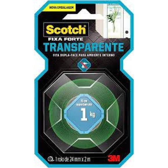 Fita adesiva dupla face transparente / Uso em: Ambiente interno / Cada 15cm de fita suportam até 1kg / Medidas: 24mm x 2m.