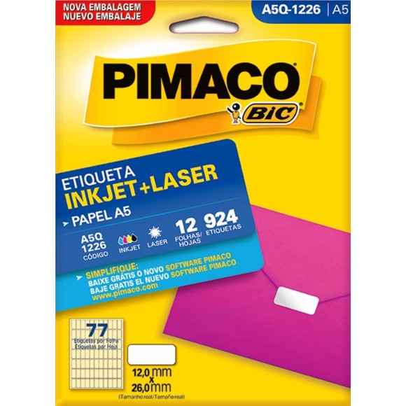 Cor: branca / Tamanho da etiqueta 12,0 x 26 mm / Etiquetas por folha: 77 / Embalagem com 12 folhas / Formato A5