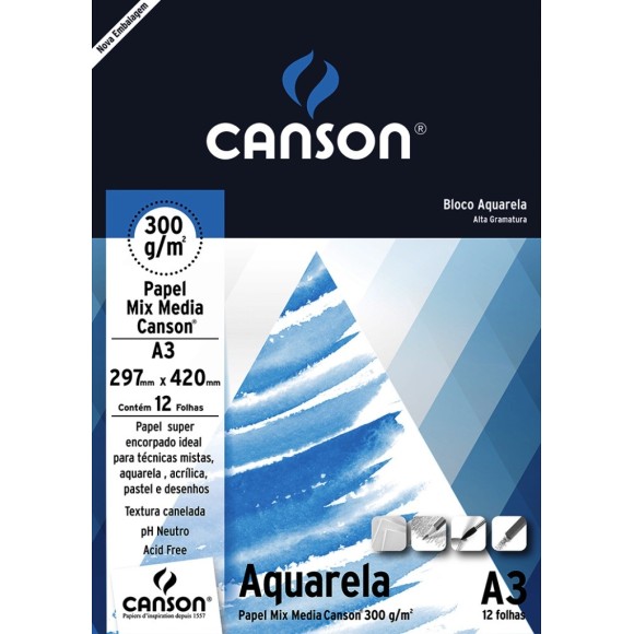 Técnicas recomendadas: Especialmente indicado para aquarela, tinta acrílica e também para técnicas secas, como giz pastel, giz oleoso e lápis de cor. / Formato: A3 / Medidas: 297 x 420mm / Gramatura: 300g/m²